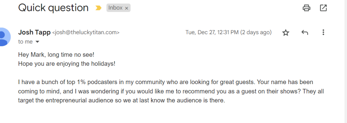 Take a look at the above totally unsolicited email message above. “Josh Tapp”, whom for the record. Before receiving his email message. I literally had no idea who he was. Although I think I had previously reached out to be a guest on his podcast.
