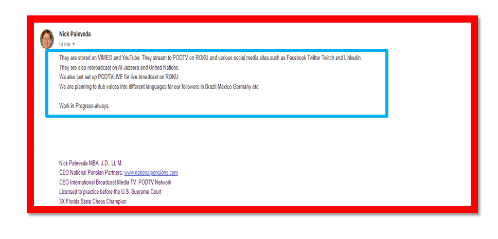 (BTW, below is me being featured with another distinguished panel of experts of Nicholas “Nick” Paleveda-s “World Edition. Which is also seen via Roku.)