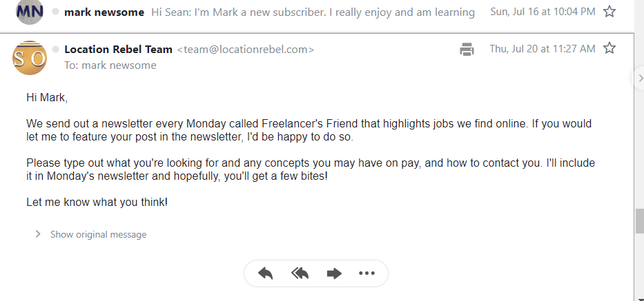 And the 3rd screenshot email message is directly from the one and only Sean Olge of “locationrebel.com” fame. I’m currently one of his many subscribers.